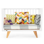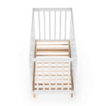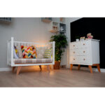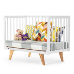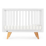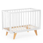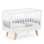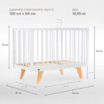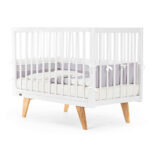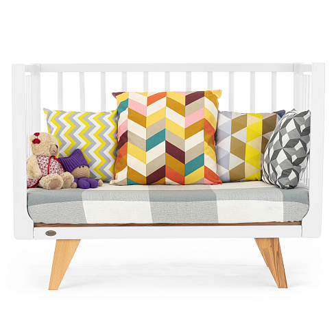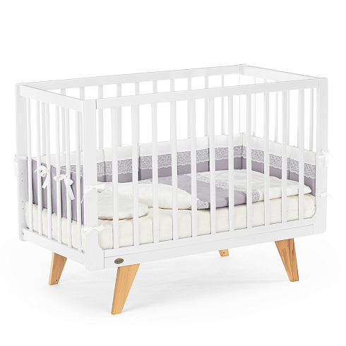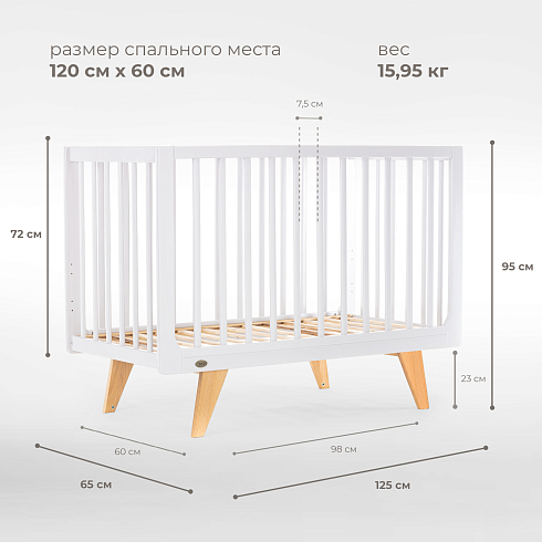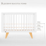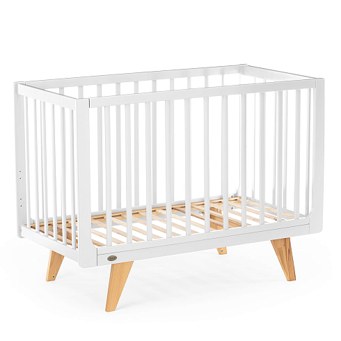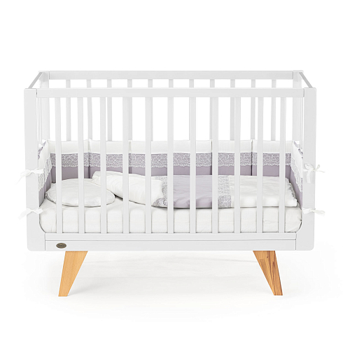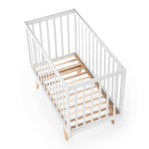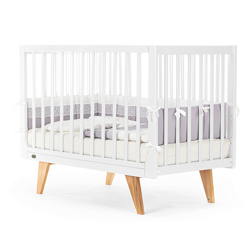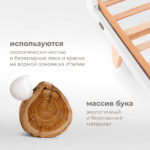 Каркас изготовлен из натурального бука, покрытого светлой глянцевой эмалью на водной основе, которая полностью нетоксична, безопасна и долговечна. Детали кроватки имеют слегка скругленные углы, а реечные бортики защищают ребёнка от падений, не закрывая обзор, что облегчает уход и контроль за малышом. Ортопедическое реечное ложе регулируется в 3 положениях, позволяя адаптировать высоту под возраст ребёнка, а съемная передняя стенка делает возможной трансформацию в диванчик.