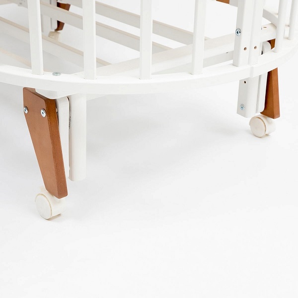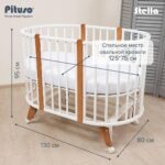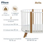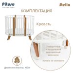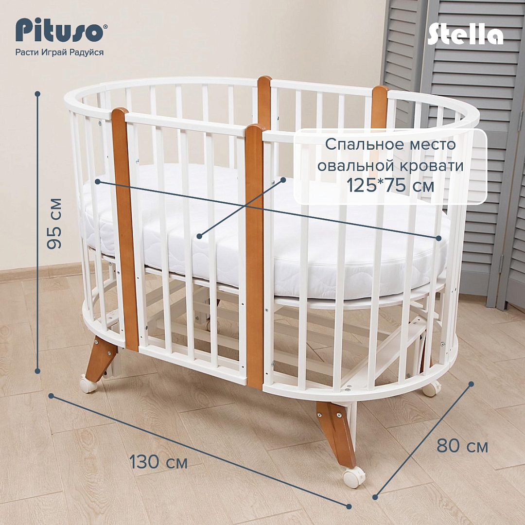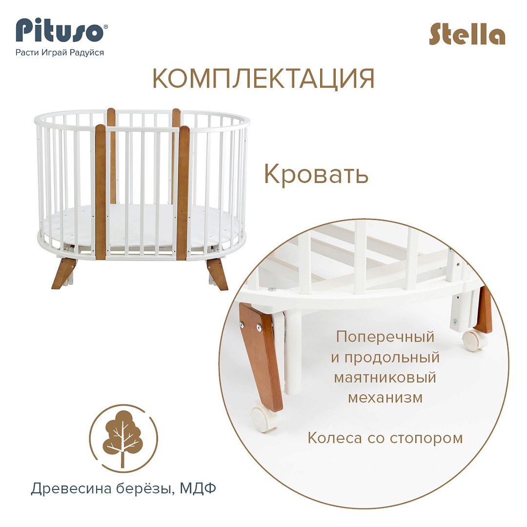 Детская кроватка‑трансформер PITUSO Stella 6/1 с универсальным маятником — рассчитана на детей от рождения до 3 лет и предлагает множество вариантов сборки: от круглой колыбели до овальной кровати с маятником или стационарной.