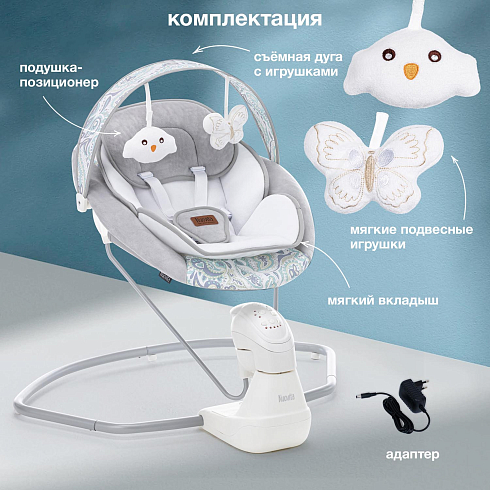 Главное достоинство модели — несколько режимов деликатного укачивания. Благодаря им малыш с удовольствием проводит время в электрокачелях: сладко дремлет или увлечённо познаёт мир с помощью развешанных на дуге игрушек. Электрокачели помогут создать ребёнку комфортное и безопасное пространство, а родителям — спокойно заниматься своими делами, оставаясь рядом.