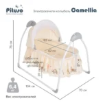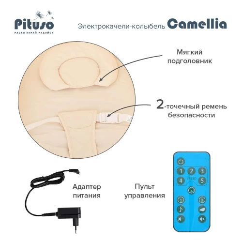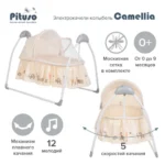 Pituso Camellia оснащена 5 режимами качания, таймером на 15, 30 и 60 минут, а также 12 встроенными мелодиями с регулировкой громкости — всё это помогает быстро выбрать подходящий ритм для расслабления малыша. Благодаря двухточечному ремню безопасности ребёнок находится в устойчивом и защищённом положении, а стопор качания позволяет использовать люльку как стационарное место для сна. Модель работает от сети или батареек, что делает её удобной и мобильной в использовании.