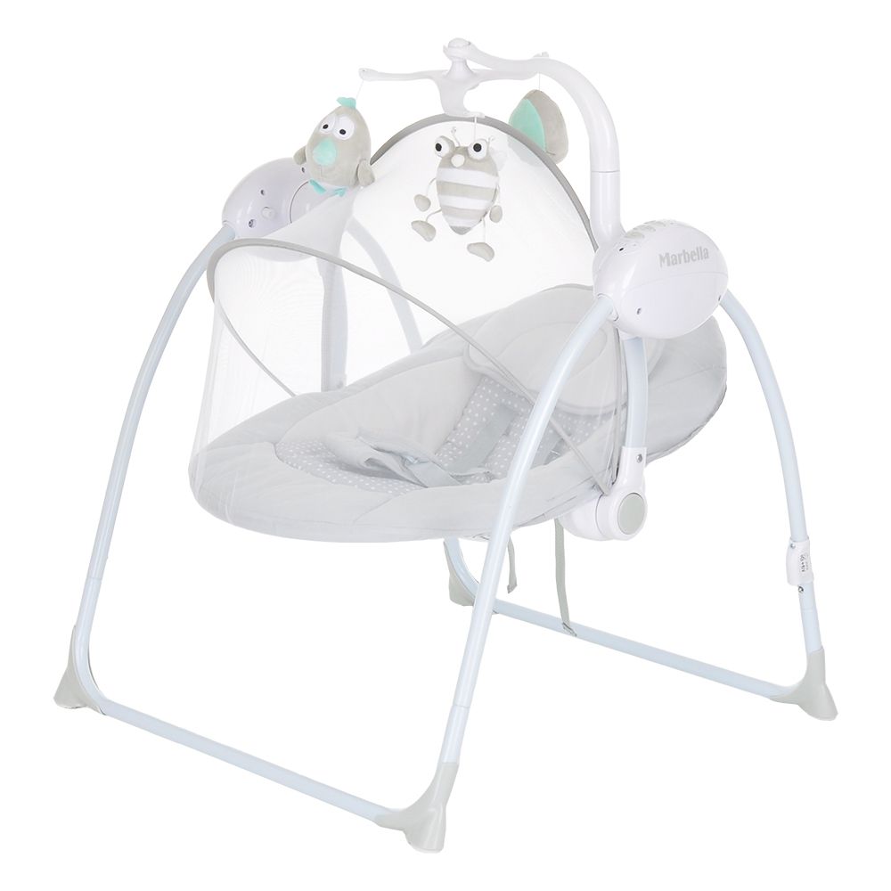 Электронные качели Pituso Marbella — лёгкие, бесшумные и комфортные качели для малышей с рождения до 1 года (до 9 кг), оснащённые 5 скоростями укачивания и таймером. Модель имеет регулируемую спинку, удобное сиденье с поддержкой головы и 5-точечные ремни безопасности. Качели легко складываются, работают от сети или батареек и подходят даже для улицы — в комплект входит антимоскитная сетка.