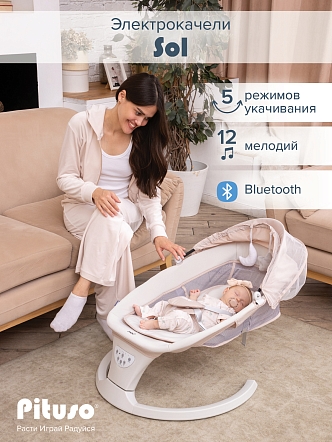 Электронные качели Pituso Sol — удобный и многофункциональный помощник для ежедневного комфорта малыша. Мягкое уютное ложе с регулируемой спинкой помогает выбрать оптимальное положение — от полусидячего до полностью горизонтального, что делает качели подходящими как для сна, так и для спокойного отдыха. Благодаря плавному покачиванию, мелодиям и мобиль-игрушкам ребёнок расслабляется, а мышцы и вестибулярный аппарат развиваются естественным образом.