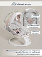 Качели оснащены ремнями безопасности, съёмным мягким вкладышем и вентиляционной сеткой, которая обеспечивает комфорт в жаркие дни. Капюшон, москитная сетка и продуманная эргономика делают Pituso Sol практичным выбором для использования дома и на даче. Модель компактно складывается, работает от сети, USB или Bluetooth, а набор функций позволяет родителям быстро подобрать режим под настроение малыша.