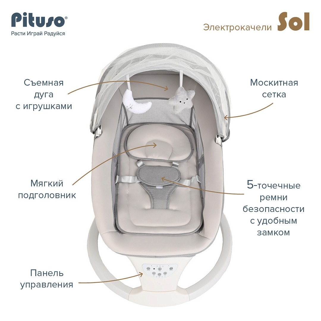 Качели оснащены ремнями безопасности, съёмным мягким вкладышем и вентиляционной сеткой, которая обеспечивает комфорт в жаркие дни. Капюшон, москитная сетка и продуманная эргономика делают Pituso Sol практичным выбором для использования дома и на даче. Модель компактно складывается, работает от сети, USB или Bluetooth, а набор функций позволяет родителям быстро подобрать режим под настроение малыша.