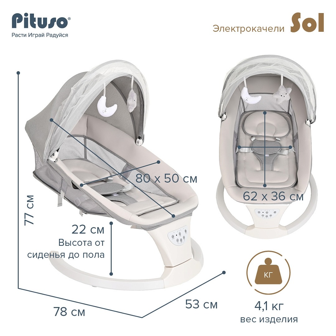 Электронные качели Pituso Sol — удобный и многофункциональный помощник для ежедневного комфорта малыша. Мягкое уютное ложе с регулируемой спинкой помогает выбрать оптимальное положение — от полусидячего до полностью горизонтального, что делает качели подходящими как для сна, так и для спокойного отдыха. Благодаря плавному покачиванию, мелодиям и мобиль-игрушкам ребёнок расслабляется, а мышцы и вестибулярный аппарат развиваются естественным образом.