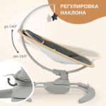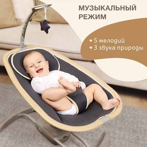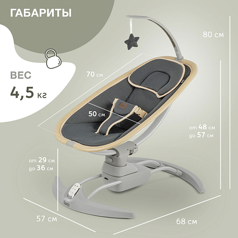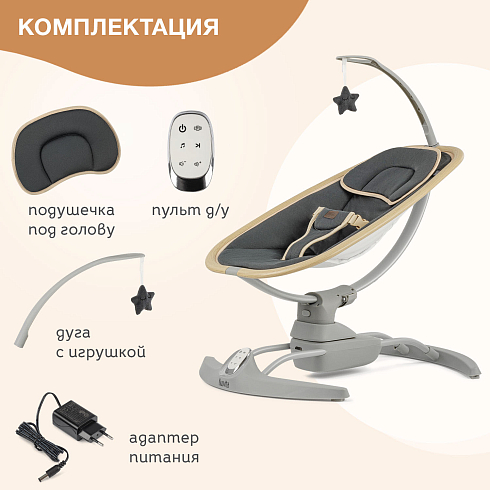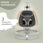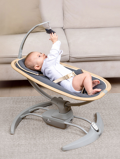 Трёхточечные ремни безопасности, устойчивое основание и небольшой вес (всего 6 кг) делают модель удобной в использовании и перемещении по комнате. Дополнительно качели оснащены пультом дистанционного управления, подушечкой и мобилью с игрушкой, что создаёт спокойную атмосферу для малыша, не перегружая его зрительное и слуховое восприятие. Элегантный лаконичный дизайн и простое управление порадуют родителей, а компактные габариты позволят размещать качели даже в небольших помещениях.