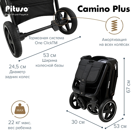 Прогулочная коляска PITUSO CAMINO Plus — стильная и функциональная коляска, созданная для комфортных и безопасных прогулок с ребёнком. С увеличенными колесами, поворотными передними колёсами и мягкой амортизацией она легко преодолевает неровные тротуары и природные тропы, обеспечивая стабильность и удобство. Просторное спальное место размером 80×35 см создаёт уют и комфорт для малыша, а коляска выдерживает вес до 22 кг, что гарантирует надёжность в каждом моменте.