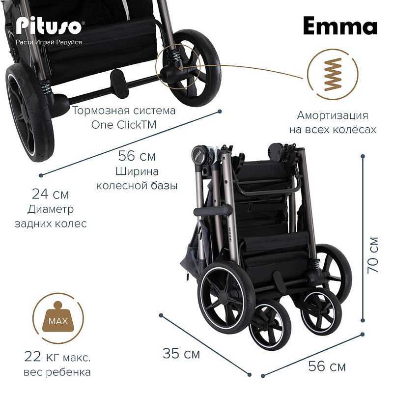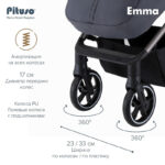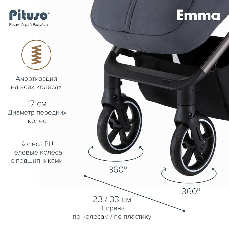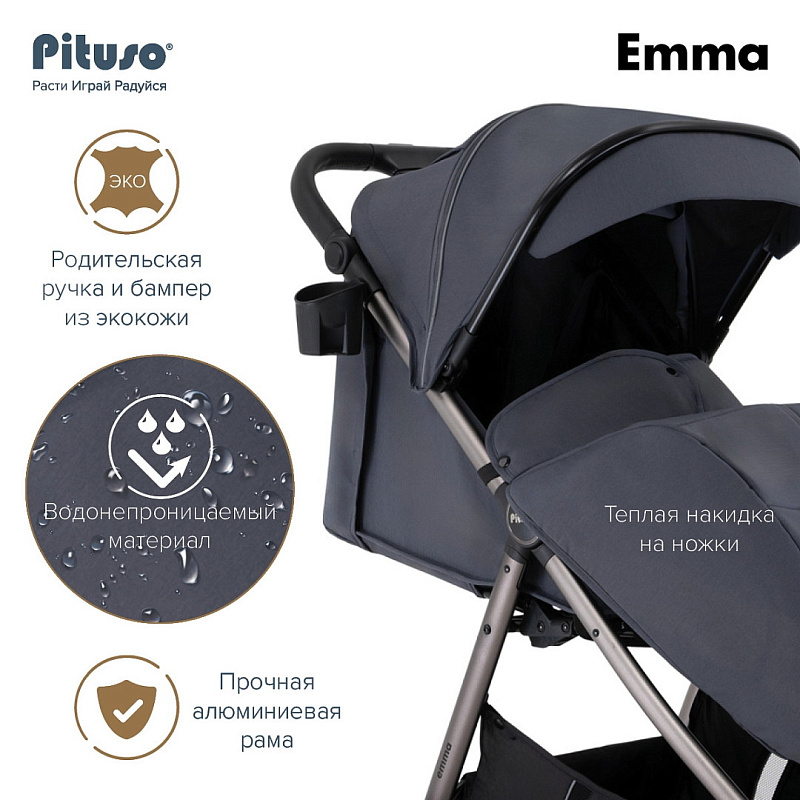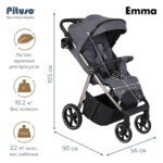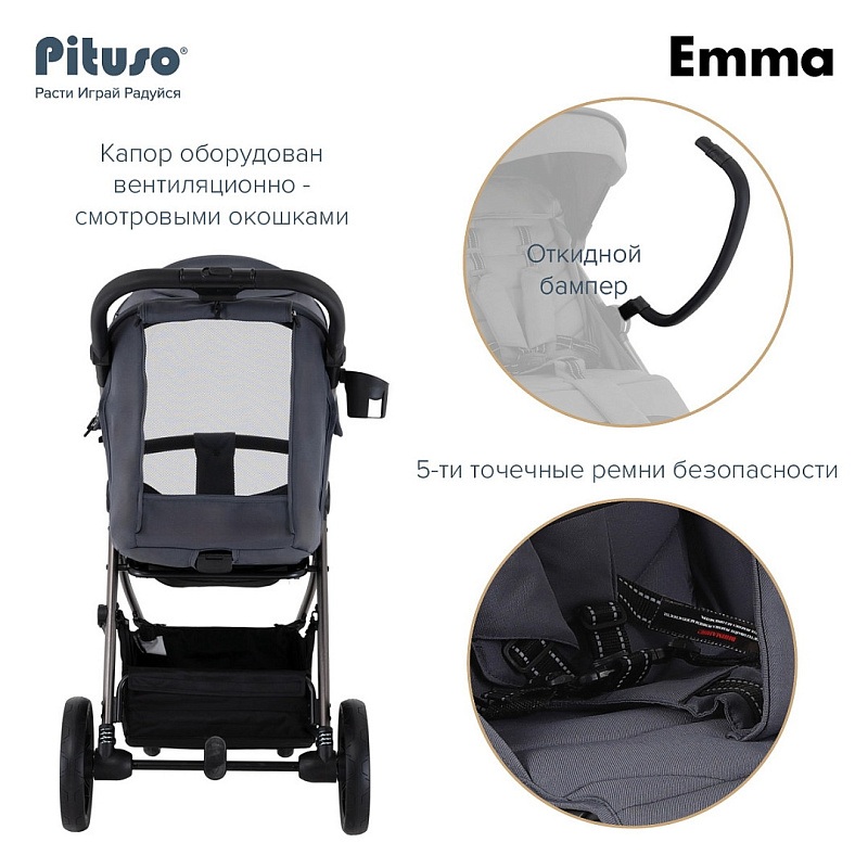 Прогулочная коляска Pituso Emma — стильная и функциональная модель для прогулок и путешествий с ребёнком. Просторное спальное место 90×36,5 см с твёрдой спинкой и удлиненной подножкой обеспечивает комфорт, а пятиточечные ремни безопасности с мягкими накладками, съёмный бампер и ограничитель сползания гарантируют надежную фиксацию малыша.