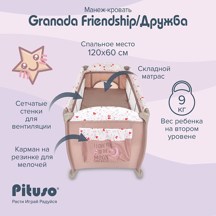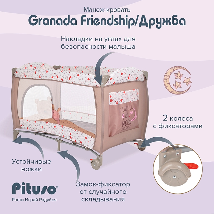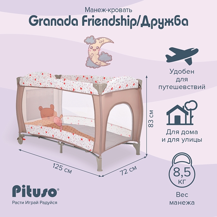 PITUSO Манеж-кровать Granada Friendship/Дружба,2-уровн-й,лаз на молнии,пласт кольца 4шт,2 колеса