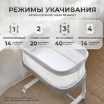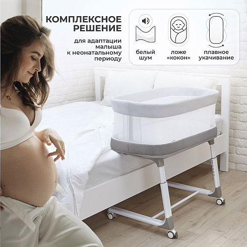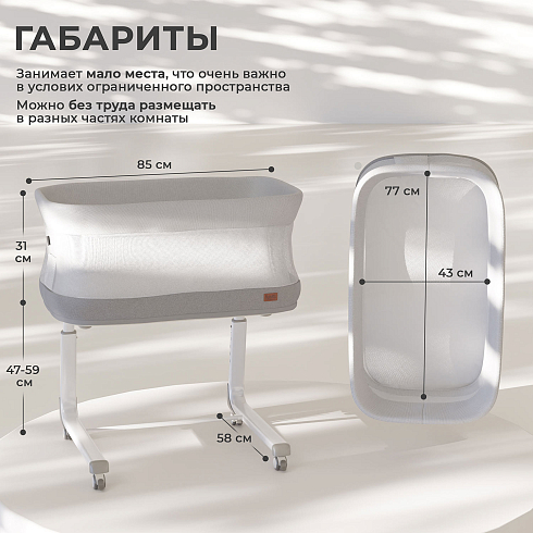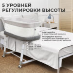 Пять уровней регулировки высоты помогают точно совместить ложе малыша с уровнем взрослой кровати, обеспечивая удобный и безопасный совместный сон. Двойные сетчатые стенки поддерживают визуальный контакт между мамой и ребёнком, а также обеспечивают свободную циркуляцию воздуха.