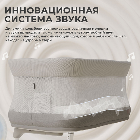 Колыбель оснащена 11 встроенными мелодиями с регулируемой громкостью и функцией памяти. Мягкое звучание способствует расслаблению и развитию слуха малыша. Управлять всеми функциями можно с помощью удобного пульта дистанционного управления.