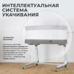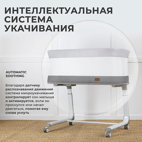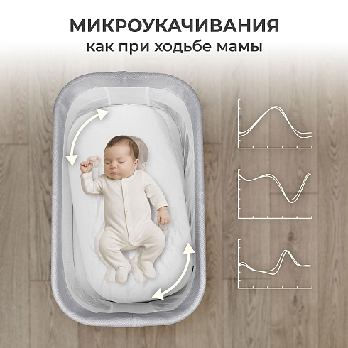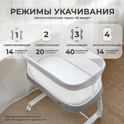 Три скорости укачивания позволяют выбрать оптимальный режим: от расслабляющего до более активного. Встроенный датчик движения автоматически включает укачивание, если ребёнок пошевелился — это помогает ему снова заснуть без посторонней помощи.