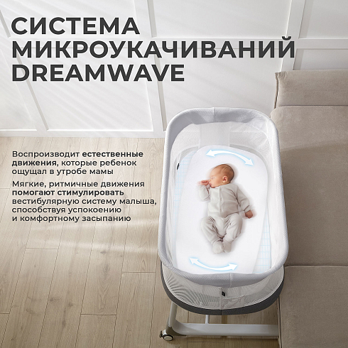 Эта модель оснащена инновационной системой укачивания Dreamwave, которая мягко покачивает ложе, имитируя естественные движения, знакомые ребёнку ещё до рождения. Благодаря такому укачиванию малыш быстрее засыпает, а мама получает дополнительные часы отдыха.