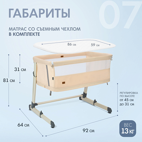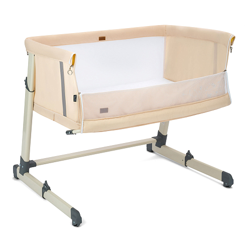 Кроватка подходит для детей с рождения до 24 месяцев. Благодаря регулируемому по высоте ложу (7 уровней — от 31 до 45 см) её можно идеально подстроить под кровать родителей. Откидной бортик на молнии позволяет использовать модель как приставную кровать — достаточно отстегнуть стенку и закрепить кроватку ремнями к взрослой постели.