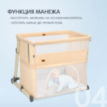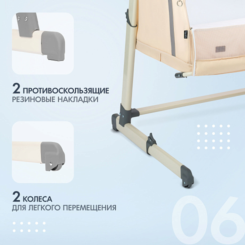 Для удобства родителей предусмотрены колёсики для перемещения и противоскользящие накладки на ножках. При необходимости кроватка легко превращается в манеж — достаточно расстегнуть молнии на основании и опустить каркас до пола.