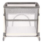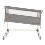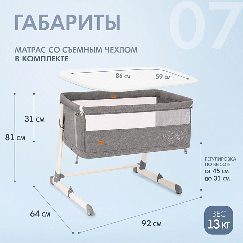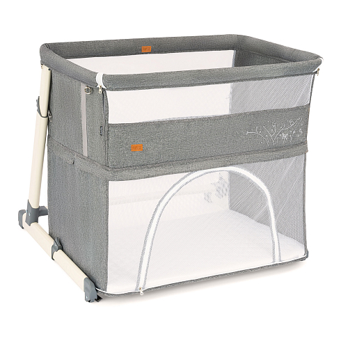 Кроватка подходит для детей с рождения до 24 месяцев. Благодаря регулируемому по высоте ложу (7 уровней — от 31 до 45 см) её можно идеально подстроить под кровать родителей. Откидной бортик на молнии позволяет использовать модель как приставную кровать — достаточно отстегнуть стенку и закрепить кроватку ремнями к взрослой постели.