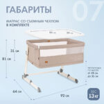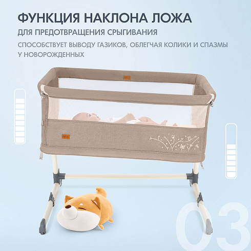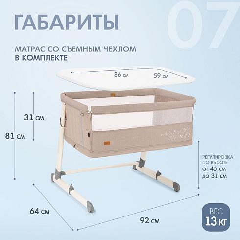 Кроватка подходит для детей с рождения до 24 месяцев. Благодаря регулируемому по высоте ложу (7 уровней — от 31 до 45 см) её можно идеально подстроить под кровать родителей. Откидной бортик на молнии позволяет использовать модель как приставную кровать — достаточно отстегнуть стенку и закрепить кроватку ремнями к взрослой постели.