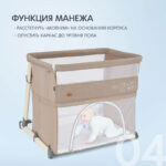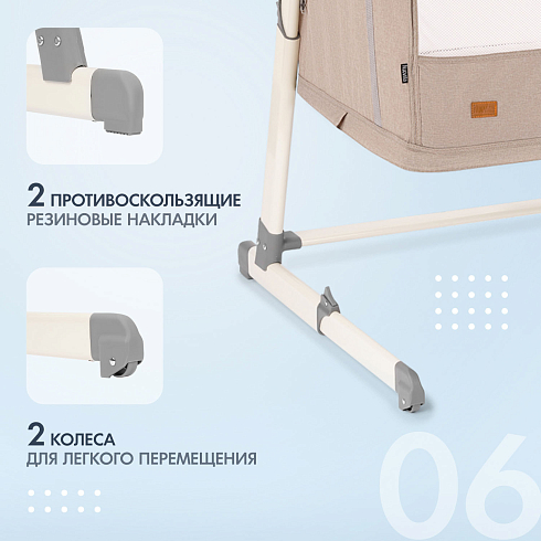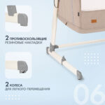 Для удобства родителей предусмотрены колёсики для перемещения и противоскользящие накладки на ножках. При необходимости кроватка легко превращается в манеж — достаточно расстегнуть молнии на основании и опустить каркас до пола.