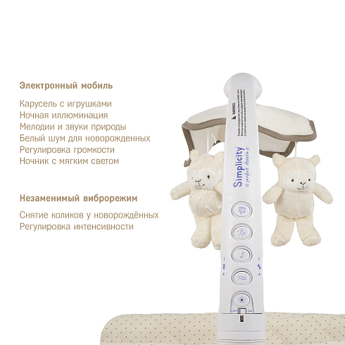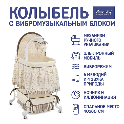 Приставная колыбель Simplicity 3070L — многофункциональная приставная колыбель, созданная для комфортного сна и отдыха малыша с рождения до 5 месяцев. Она совмещает в себе три режима: приставную кроватку, колыбель на колёсах и колыбель-качалку. Благодаря электронной системе укачивания, мелодиям и мягкому ночнику, сон ребёнка становится спокойным и безмятежным.