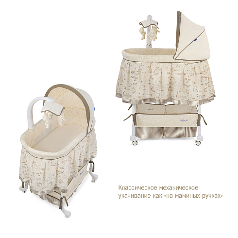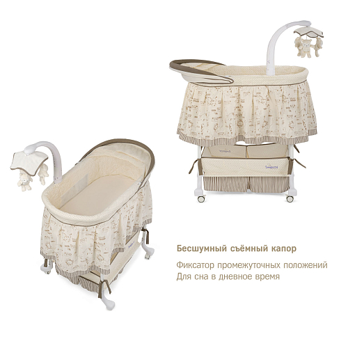 Встроенная вибрационная система, успокаивающие мелодии, мерцающие огоньки и съёмный музыкальный мобиль с тремя игрушками помогут быстро убаюкать малыша. Конструкция легко регулируется по высоте и подстраивается под уровень взрослой кровати.