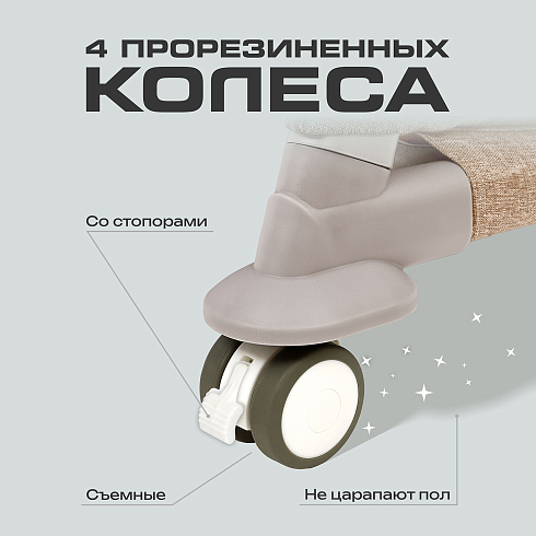 Прорезиненные колёса со стопорами не царапают пол и обеспечивают плавное, бесшумное перемещение по дому.