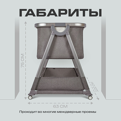 Благодаря ширине 63 см, колыбель легко проходит в дверные проёмы. Две эргономичные ручки делают переноску безопасной и удобной.