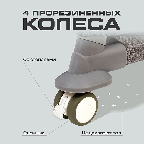 Прорезиненные колёса со стопорами не царапают пол и обеспечивают плавное, бесшумное перемещение по дому.