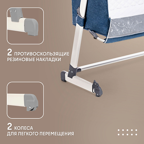 Приставная кроватка Nuovita Accanto — удобная и элегантная модель, выполненная из практичного материала с лёгким для стирки чехлом и эластичным полиуретановым матрасом. Кроватка устанавливается на противоскользящие ножки, регулируемые в двух положениях, что позволяет безопасно располагать её рядом с кроватью взрослых независимо от конструкции.