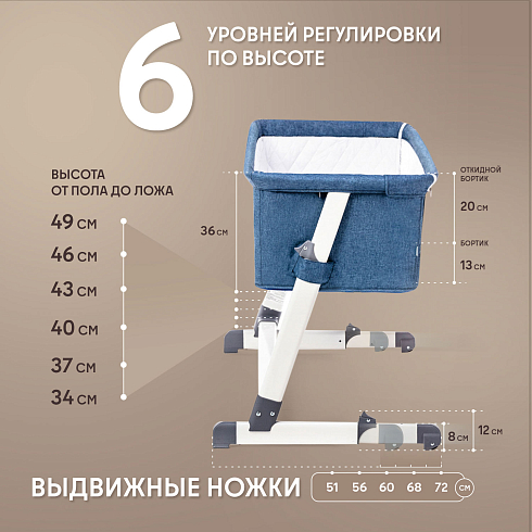 Для точного выравнивания предусмотрено пять уровней регулировки по высоте. Передний бортик выполнен из «дышащей» сетчатой ткани, обеспечивающей циркуляцию воздуха и возможность наблюдения за ребёнком.