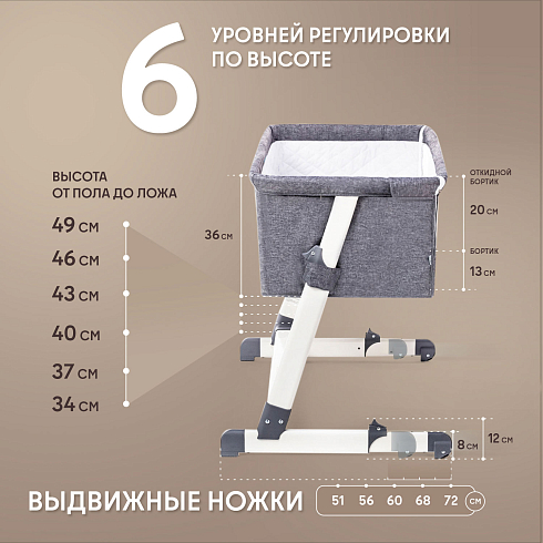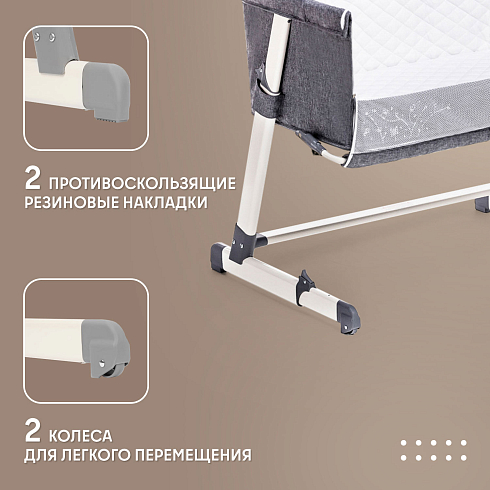 Приставная кроватка Nuovita Accanto — удобная и элегантная модель, выполненная из практичного материала с лёгким для стирки чехлом и эластичным полиуретановым матрасом. Кроватка устанавливается на противоскользящие ножки, регулируемые в двух положениях, что позволяет безопасно располагать её рядом с кроватью взрослых независимо от конструкции.