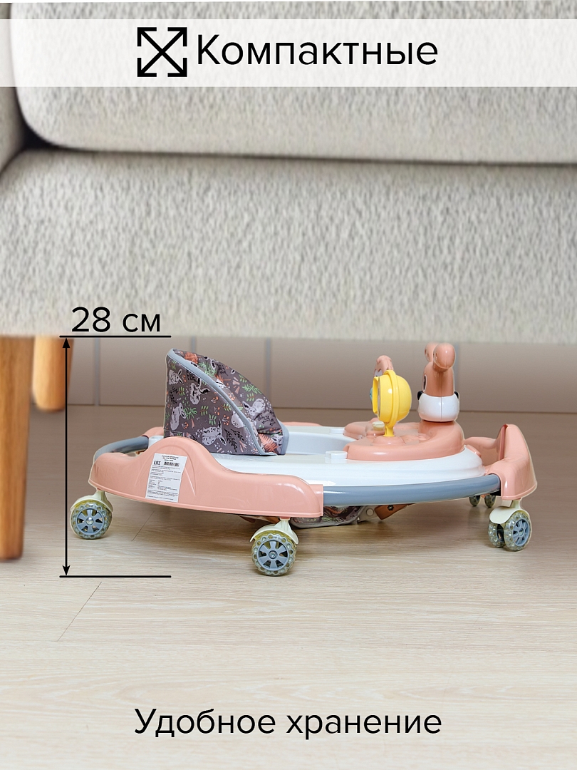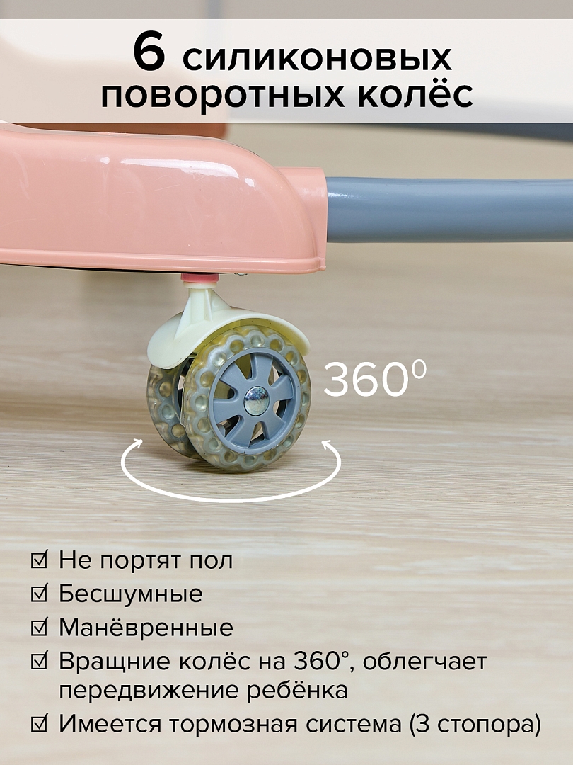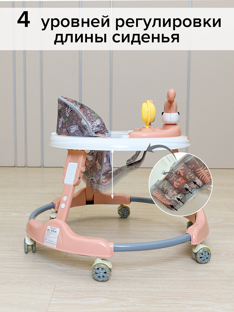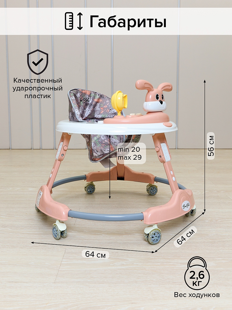 BAMBOLA Ходунки — это удобное и безопасное решение для первых самостоятельных шагов вашего малыша. Они развивают координацию движений, помогают удерживать равновесие и стимулируют активность ребенка, позволяя ему делать шаги увереннее и раньше. Съёмная музыкальная игровая панель с яркими кнопками привлекает внимание ребёнка, развивает мелкую моторику, а при необходимости превращается в столик для игр или кормления. Эргономичное мягкое сиденье и регулируемая высота делают ходунки комфортными для ребенка любого роста. Конструкция легко складывается для хранения и транспортировки, а широкое основание и устойчивые колеса обеспечивают максимальную безопасность.