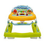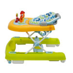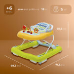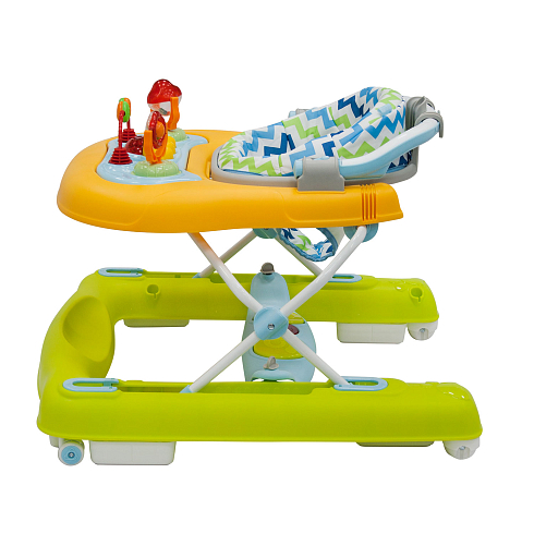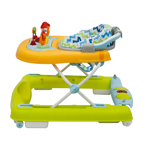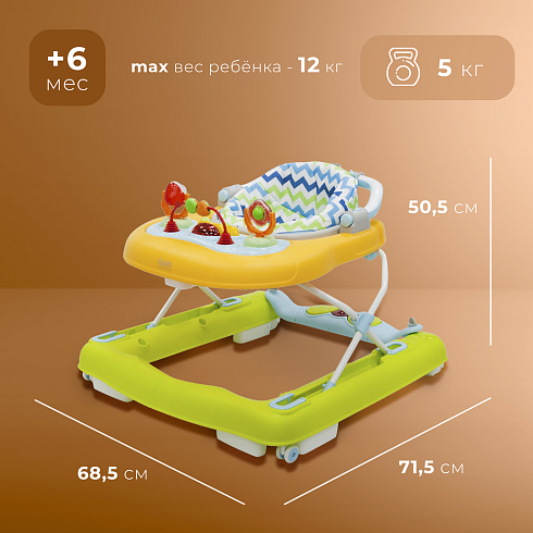 Модель оснащена прочным металлическим каркасом, прорезиненными колёсами, регулируемым сиденьем и двумя игровыми панелями для развития моторики и первых шагов.