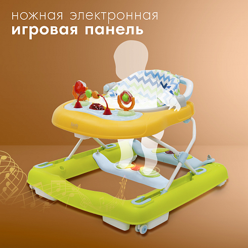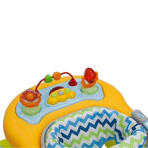 Особенностью модели является нижняя ножная игровая панель с музыкальными эффектами, вибрацией и подсветкой — она стимулирует малыша делать движения ножками. Верхняя игровая панель крепится на столике и оснащена игрушками для развития моторики.
