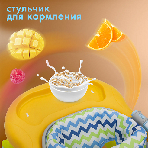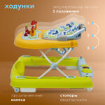 Ходунки можно использовать как толкатель для детей, начинающих ходить, а также как столик для кормления. Сиденье регулируется по высоте, выполнено из моющейся ткани, имеет мягкий наполнитель и поддерживает спину ребёнка.