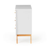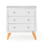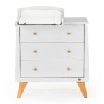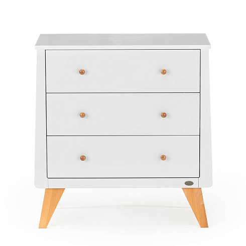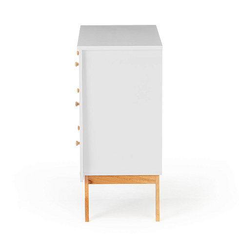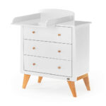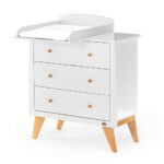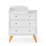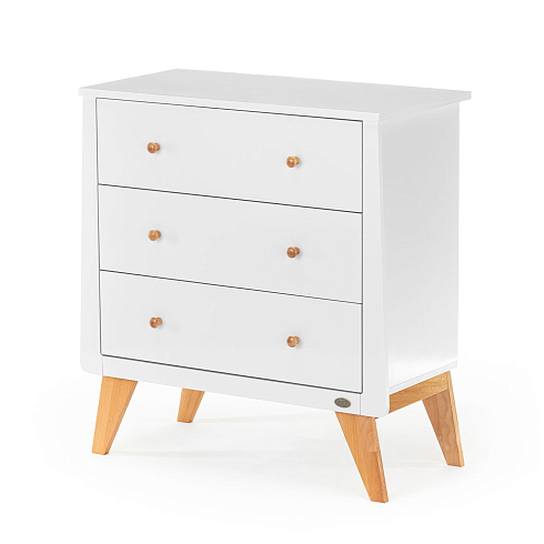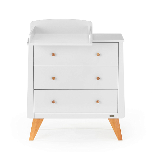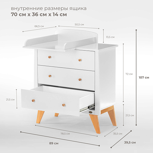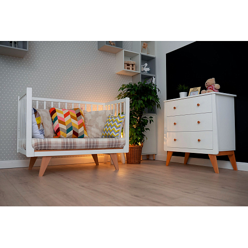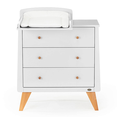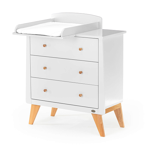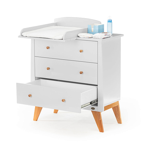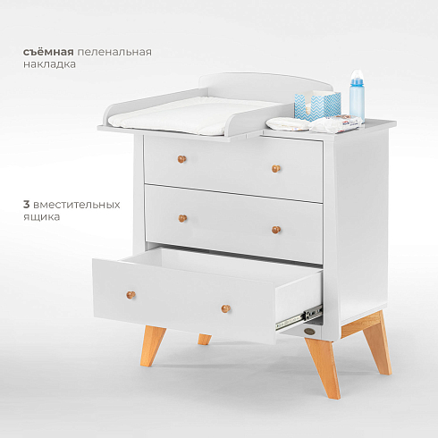 Особенностью комода является съёмная пеленальная накладка, которую можно установить как с левой, так и с правой стороны. Комод выполнен в скандинавском стиле: нейтральные оттенки, строгие линии и натуральное дерево создают гармоничный интерьер детской комнаты. Конструкция безопасна для ребёнка: нет острых углов, а лакокрасочные покрытия нетоксичны и долговечны.