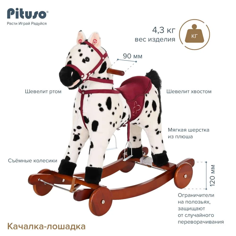 Плюшевая качалка-лошадка Pituso Fandango с музыкой — это стильная интерактивная игрушка для малышей старше года, которая сочетает в себе безопасность, реалистичность и массу эмоций. Лошадка шевелит хвостом и ртом, проигрывает музыку, издаёт цокот копыт и ржание, превращая каждую поездку в настоящее приключение. Широкие деревянные полозья с ограничителями, удобное седло, стремена и мягкий плюш делают катание комфортным и безопасным.
