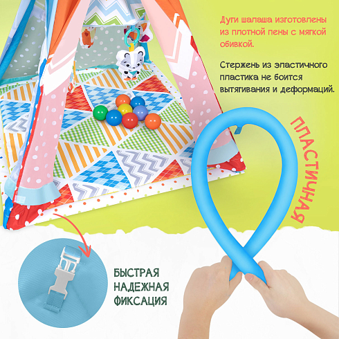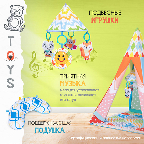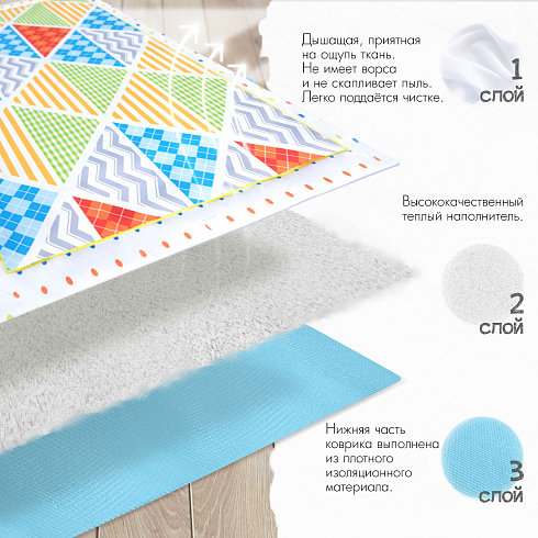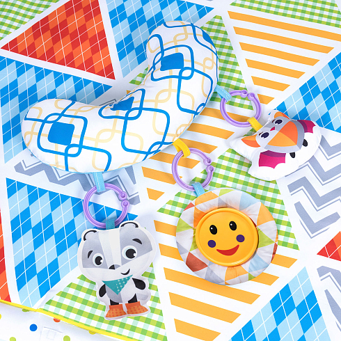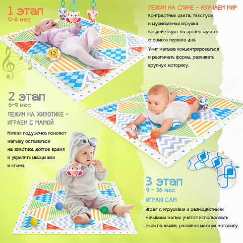 Ребёнок быстро освоит первые навыки и совсем скоро начнёт следить за предметами, тянуться к ним, захватывать, удерживать головку и переворачиваться на животик. Мягкая основа коврика из современных, лёгких в уходе материалов обеспечит малышу комфорт: на ней будет тепло даже на холодном полу, а приятная на ощупь текстура подарит новые тактильные ощущения.