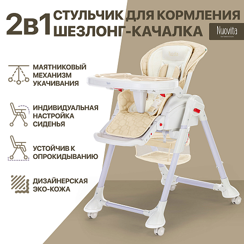 Стул-шезлонг для кормления Nuovita Tutela — многофункциональный стул-шезлонг, подходящий для детей с рождения до 3 лет (до 15 кг). Совмещает функции шезлонга с маятниковым укачиванием и стульчика для кормления. Регулируемая спинка и подножка, удобное экокожаное сиденье и компактное складывание делают модель практичной и комфортной для родителей и малыша.