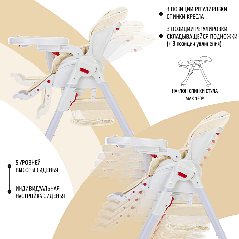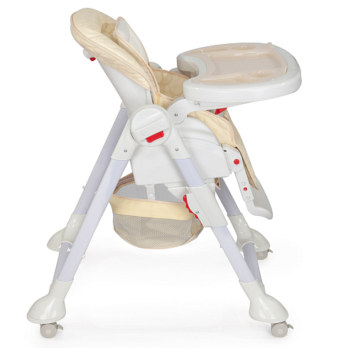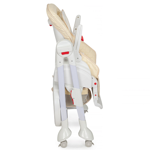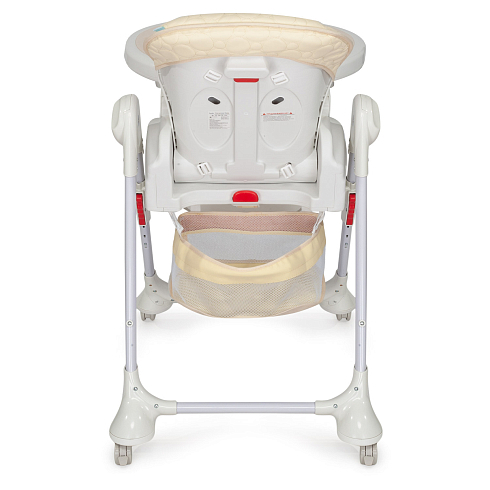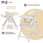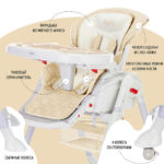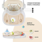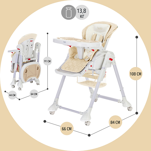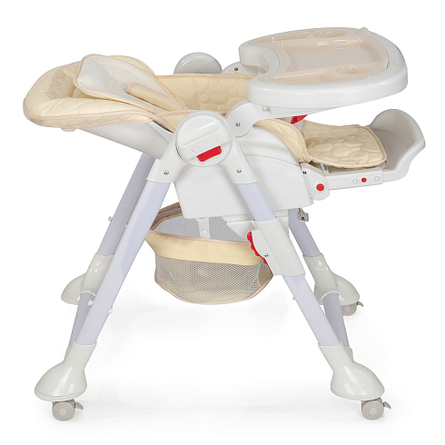 Сиденье выполнено из прочной и приятной на ощупь экокожи, которую легко очищать. В комплекте есть корзина для игрушек, поворотные колёса с фиксаторами, съёмный поднос с углублениями и возможность компактного хранения в сложенном виде.