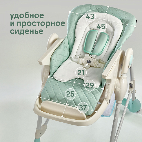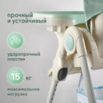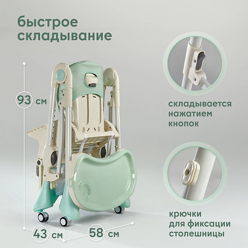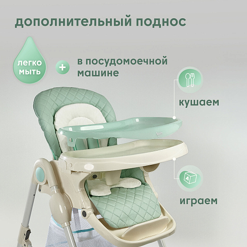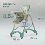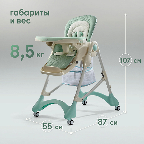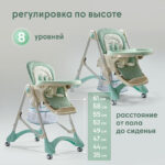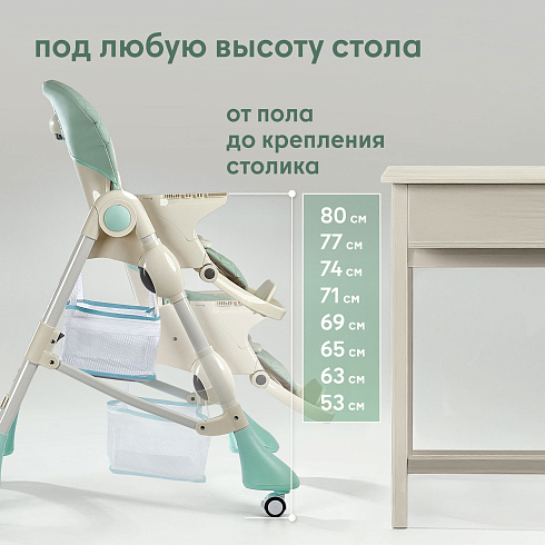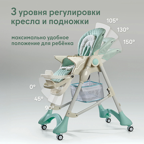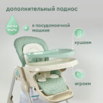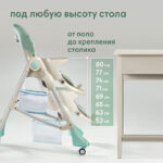 Стульчик легко подстраивается под рост ребёнка благодаря регулируемой спинке с тремя положениями наклона, семи уровням высоты сиденья и трём вариантам подножки. Широкая съёмная столешница с дополнительным вкладышем позволяет удобно кормить ребёнка и легко её мыть. Подвесная корзина для игрушек и аксессуаров помогает хранить необходимые предметы под рукой, а колёсики со стопорами делают перемещение стульчика по дому лёгким и безопасным.