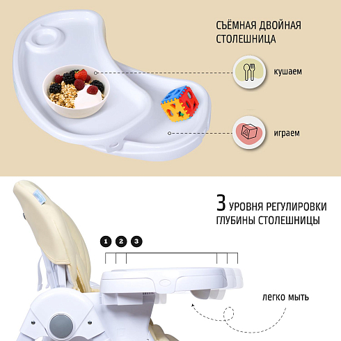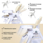 Стульчик оснащён надёжными пятиточечными ремнями безопасности и мягким анатомическим вкладышем, который поддерживает спинку малыша и обеспечивает правильное положение. Регулируемая спинка с тремя уровнями наклона и 7 уровней высоты сиденья позволяет подстроить стульчик под рост ребёнка, а подножка с тремя положениями создаёт дополнительный комфорт для ног.